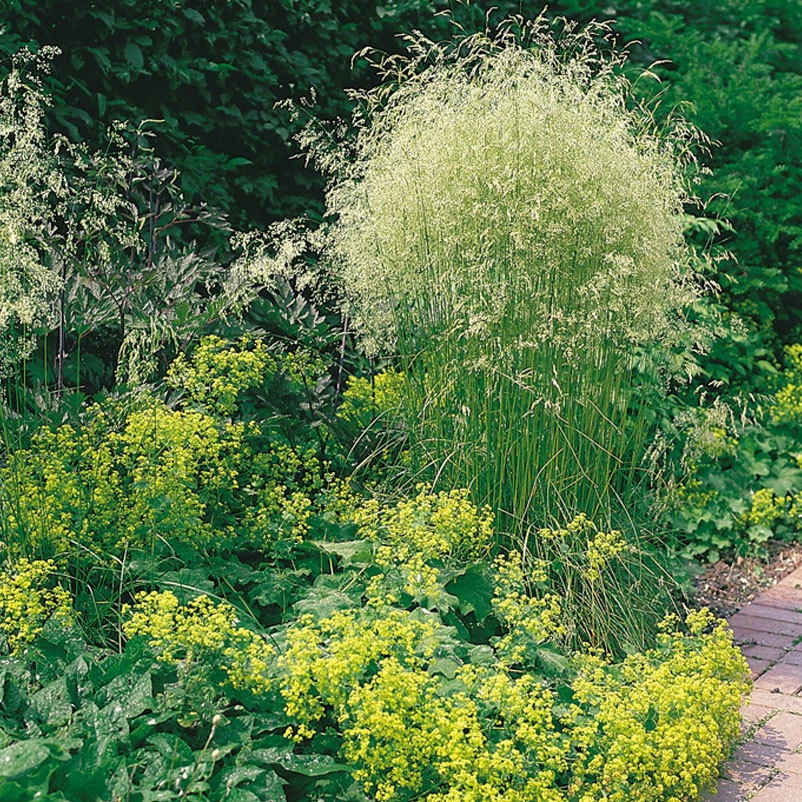 Mit der Rasen-Schmiele lässt sich ein nahezu unendliches Spektrum verschiedenster Gestaltungsideen verwirklichen. Die schmalen, dunkelgrünen Blätter treiben früh aus und erfreuen mit einem besonders hohen Zierwert. Im Hochsommer erscheinen außerdem grünliche Blütenrispen, deren Farbe sich mit dem beginnenden Herbst in strahlendes Goldgelb wandelt, welches den Garten in zauberhaftem Licht erscheinen lässt. Um unerwünschte Selbstaussaat zu vermeiden, empfiehlt es sich, die Blüte der Rasen-Schmiele rechtzeitig abzuschneiden.
