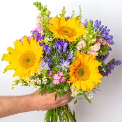 Mit unserem lebendigen Blumenstrauß ‘Lyon’ (ca. 25-30 cm) holen Sie sich leuchtende Farben und ein Stück Sommersonne in Ihr Zuhause! Die Kreation strahlt Wärme und Gemütlichkeit aus und sorgt für gute Laune. Das Herzstück des Arrangements sind strahlende, kleinblütige Sonnenblumen, die zusammen mit verspielten Löwenmäulchen in Rosa und eleganten, dunkelblauen Schmucklilien wunderbar sommerliche Akzente setzen. Begleitet werden sie von luftigem Stranfdlieder, Bartnelken in Pink und den vielen kleinen Blüten der Zierkamille, was dem Strauß sein wiesenartiges Aussehen verleiht. Pistazie, Hirtentäschelkraut und Solidago bilden den abschließenden Rahmen und verbinden die einzelnen Sommerblumen zu einem prächtigen Werkstück. Egal ob Geburtstag, Jahrestag oder einfach nur als liebe Geste, der Strauß ‘Lyon’ ist das perfekte Geschenk für jeden Anlass.