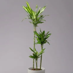 Dracaena fragrans ‘Cintho’ fällt in erster Linie durch eine beeindruckende Blattzeichnung in fröhlichem Limettengrün auf. Diese Zimmerpflanze erhalten Sie in einem anspruchsvoll gestalteten 3er-Tuff mit verschieden hohen Stämmen für eine rundum effektvolle Optik. Je nach Wunsch können Sie die Dracaena ‘Cintho’ als Solitär oder zusammen mit weiteren Tropengewächsen zur Begrünung von Ihrem Wohnzimmer, Office oder Ihrer Küche einsetzen. Ihre Dracaena ist dabei weit mehr als nur eine immergrüne Zierde, sondern auch ein zuverlässiger Luftfilter. Die Drachenbäume reduzieren die Mengen an gesundheitsschädlichen Substanzen wie Benzol und Formaldehyd und reichern dafür die Luft mit lebensspendendem Sauerstoff an. Vorteilhaft ist ein geringer Pflegeaufwand, denn eine Dracaena ist nur relativ selten zu gießen und gedeiht sowohl in hellen als auch in halbschattigen Lagen.