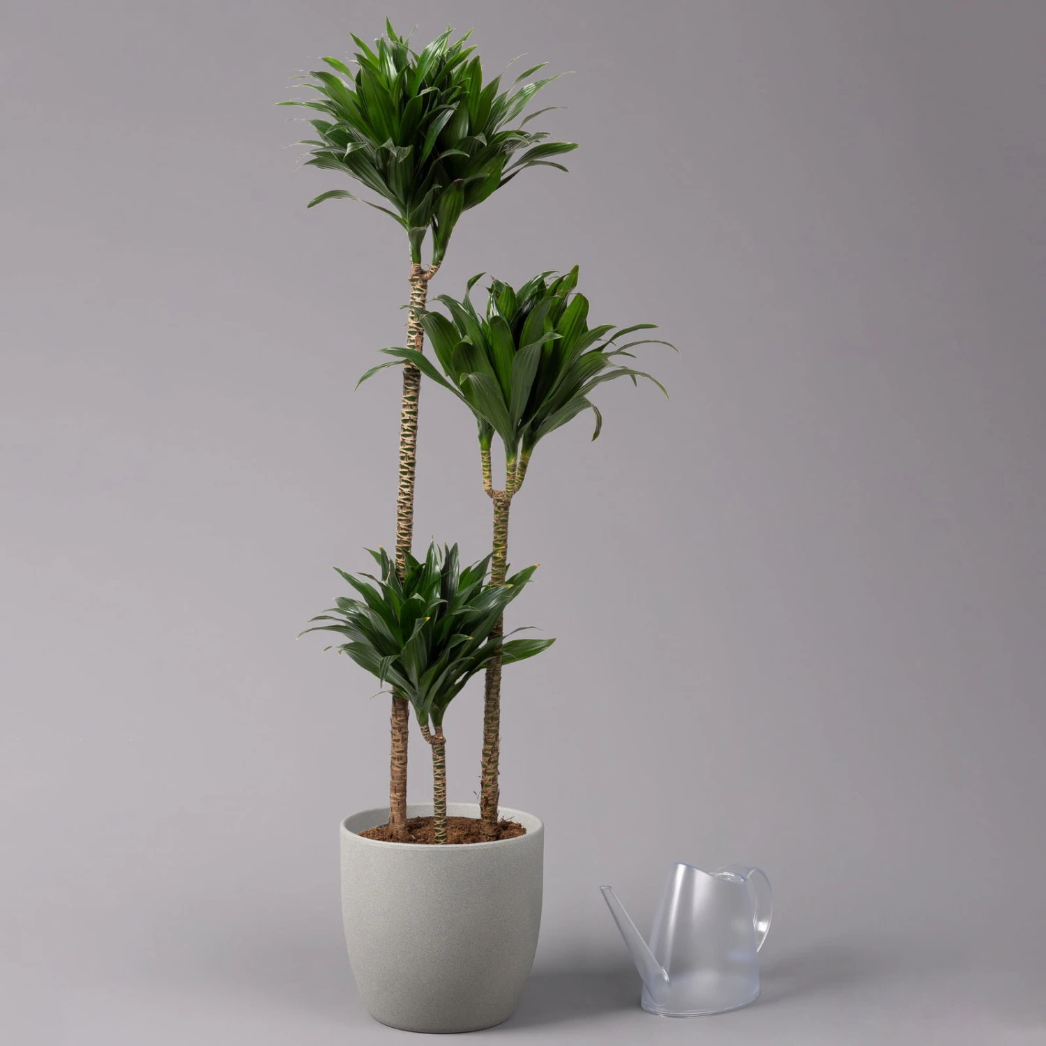 Der Drachenbaum ‘Compacta’ ist ein Klassiker unter den Drachenbäumen und eignet sich gleich gut für die Begrünung von Wohnräumen und Büros. Dieses Spargelgewächs mit sattgrünen, relativ breiten Blättern ist einfach zu pflegen und verzeiht Ihnen etliche Anfängerfehler. Suchen Sie für Ihren Drachenbaum einen halbschattigen oder hellen, absonnigen Standort in einiger Entfernung zum Fenster aus. Seien Sie sparsam beim Gießen, denn die Dracaena ‘Compacta’ benötigt nicht allzu viel Wasser. Die Staunässe ist unbedingt zu vermeiden. Wie die meisten Drachenbäume vermag es auch diese Art, diverse Schadstoffe wie Formaldehyd oder Benzol der Luft zu entziehen. Aus diesem Grund empfehlen wir Ihnen die Zimmerpflanze explizit für Büros, Küchen oder Raucherwohnungen.