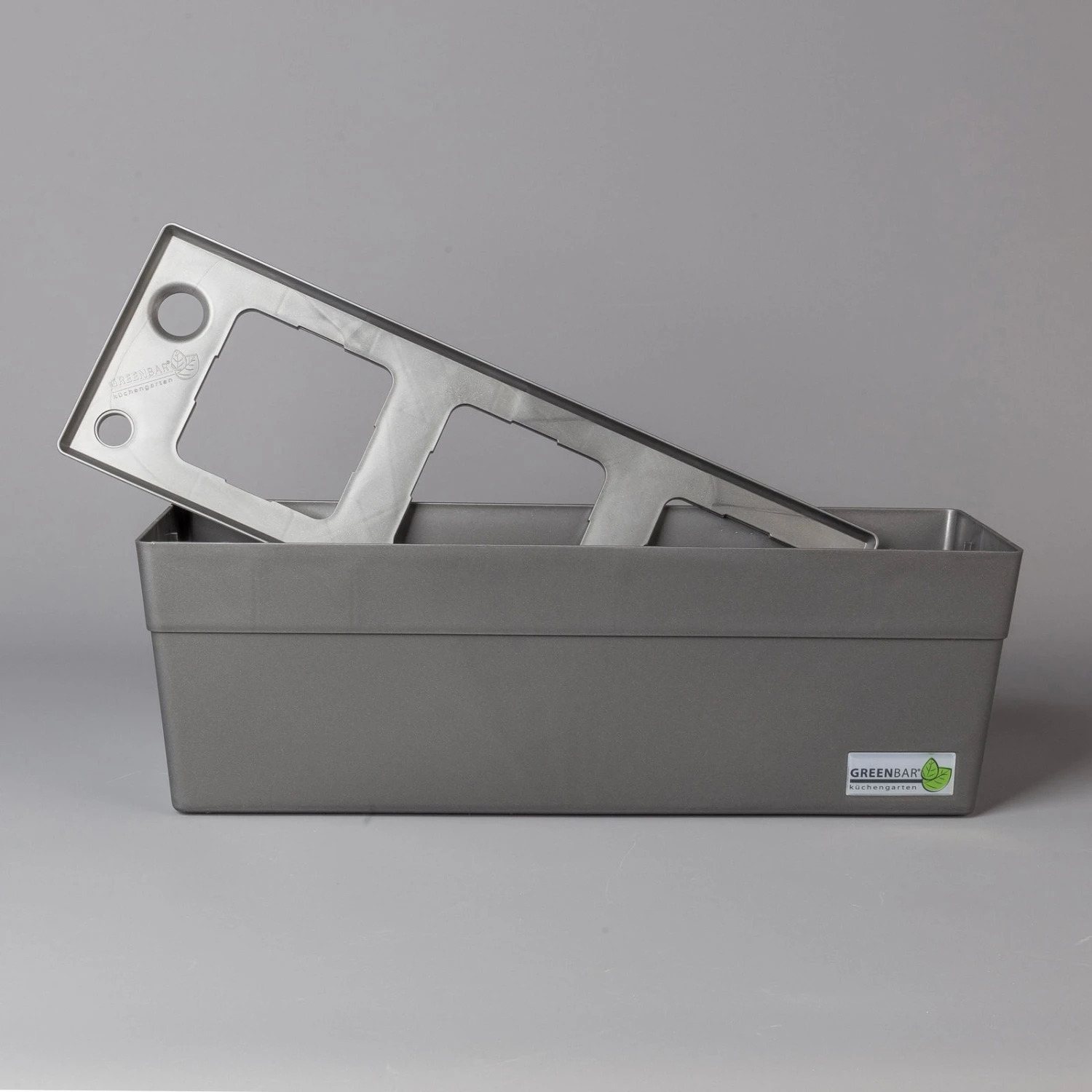 Die Greenbar® ermöglicht eine äußerst pflegeleichte Kultur verschiedenster Gemüsepflanzen und Kräuter. Über ein integriertes Bewässerungssystem werden sie mit der optimalen Menge an Wasser und Nährstoffen versorgt. Die Pflanztöpfe werden hierzu auf ein spezielles Bewässerungsvlies in die Greenbar® gestellt und der Wasserhaushalt ganz einfach über ein Einfüllloch und eine Wasserstandsanzeige geregelt. Um Staunässe und eine Schädigung der Wurzeln zu vermeiden, sollte der Wasserstand nicht permanent genau zwischen ‘Min’ und ‘Max’ liegen, sonder eher in Zyklen zwischen Nass und Trocken oszillieren. Ein regelmäßiges Abtrocknen des Substrats ist förderlich, ein völliges Austrocknen hingegen nicht. Fällt der Wasserstand dauerhaft unter ‘Min’, vertrocknen die Pflanzen und werden nicht mehr mit den nötigen Nährstoffen versorgt, überschreitet der Wasserstand ‘Max’ für längere Zeit ist für die Pflanze nicht genug Sauerstoff verfügbar. Zum guten Gedeihen brauchen die Grillkräuter in der Greenbar® lediglich einen sonnigen Standort drinnen oder draußen am Fenster, auf dem Balkon oder der Terrasse.
