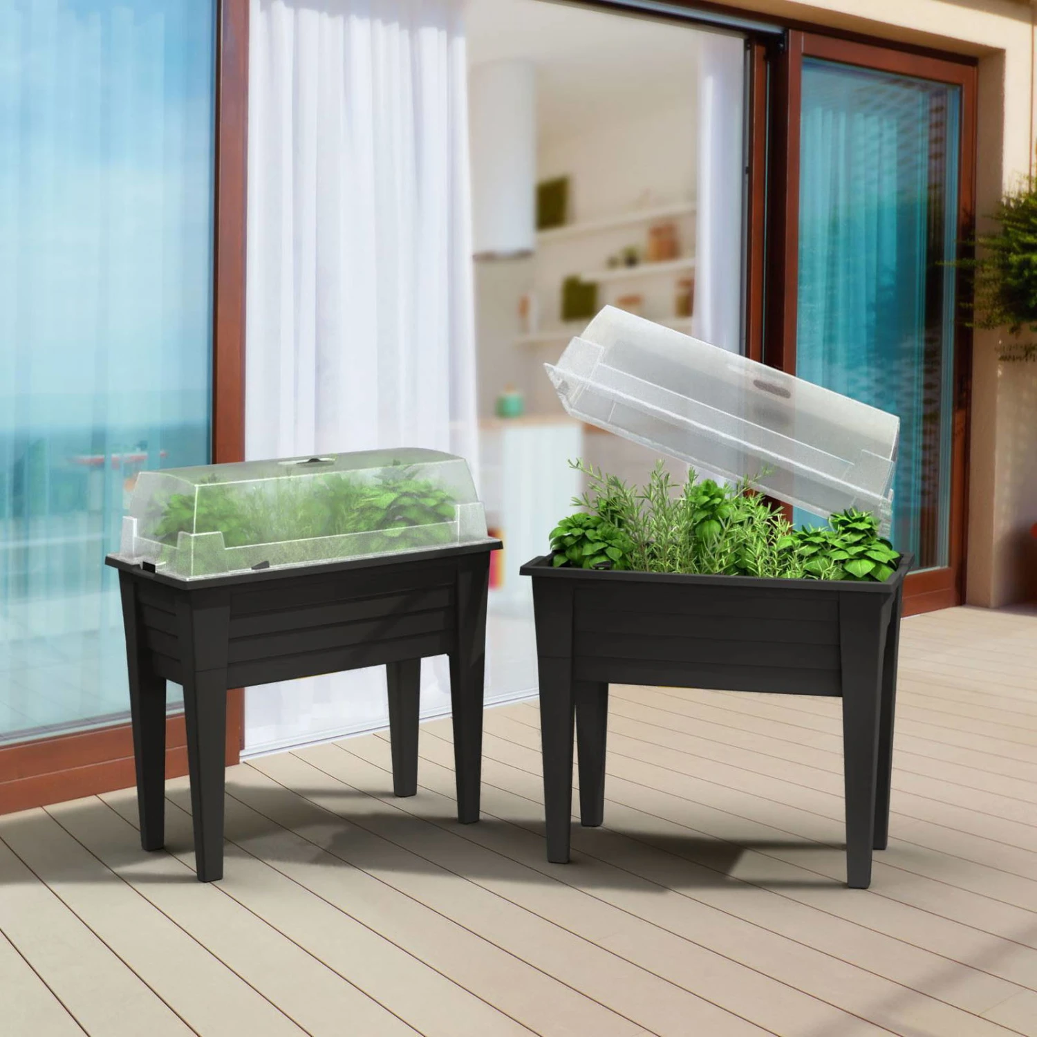 Pflanzkasten aus witterungsbeständigem Kunststoff (Polypropylen) zum Anziehen und Anbauen von Kräutern, Gemüsepflanzen, Blumen, etc. Die ergonomische Arbeitsfläche des Hochbeets für den Garten, die Terrasse oder den Balkon erleichtert die Pflanzarbeiten und die Pflanzenpflege. Die belüftbare Abdeckhaube sorgt für bestes Klima und trägt dadurch zu einem schnelleren Pflanzenwachstum bei.