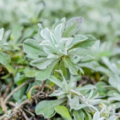 Die lanzettlichen Blätter des Katzenpfötchens (Antennaria dioica ‘Rubra’) sind silbergrau und behaart. Das Katzenpfötchen wächst teppichartig, kriechend in kleinen Rosetten und ist bodendeckend. Die winterharte Staude kann eine Wuchshöhe von 10 bis max. 15 cm erreichen.