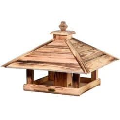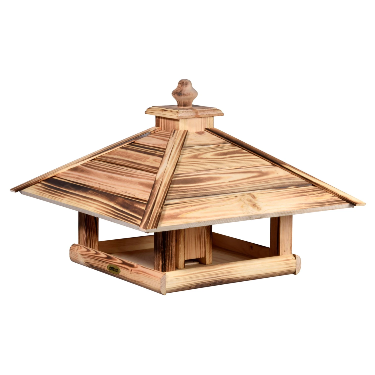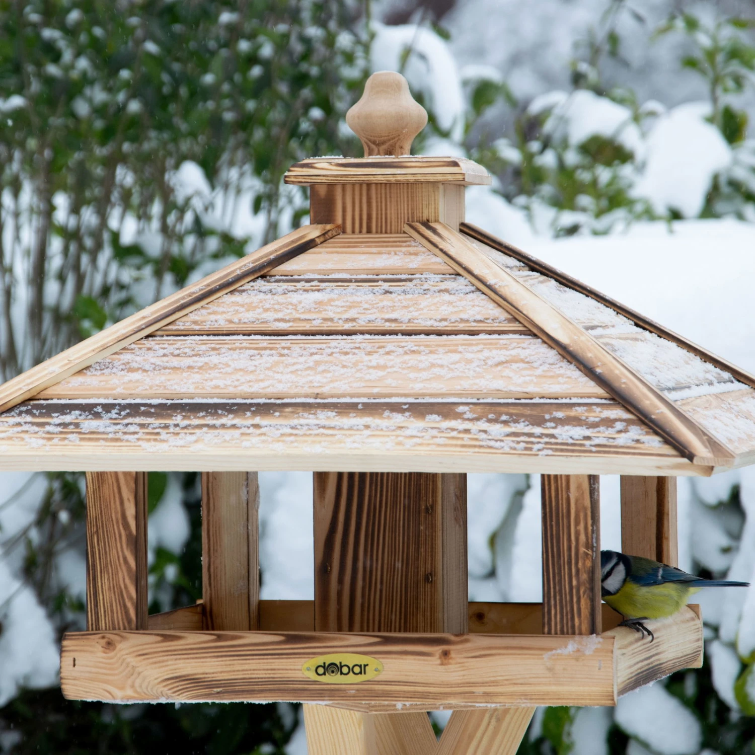 Das Vogelfutterhaus ‘Heat’ versorgt die Wildvögel mit schmackhaften Sämereien und wird daher rund ums ganze Jahr frequentiert. Dieses rustikale Futterhäuschen aus geflammtem FSC®-zertifiziertem Kiefernholz eignet sich zum Aufstellen oder zur Montage auf einem Ständer. Besonders praktisch ist das Futtersilo, welches die Leckereien vor Wind und Feuchtigkeit schützt.