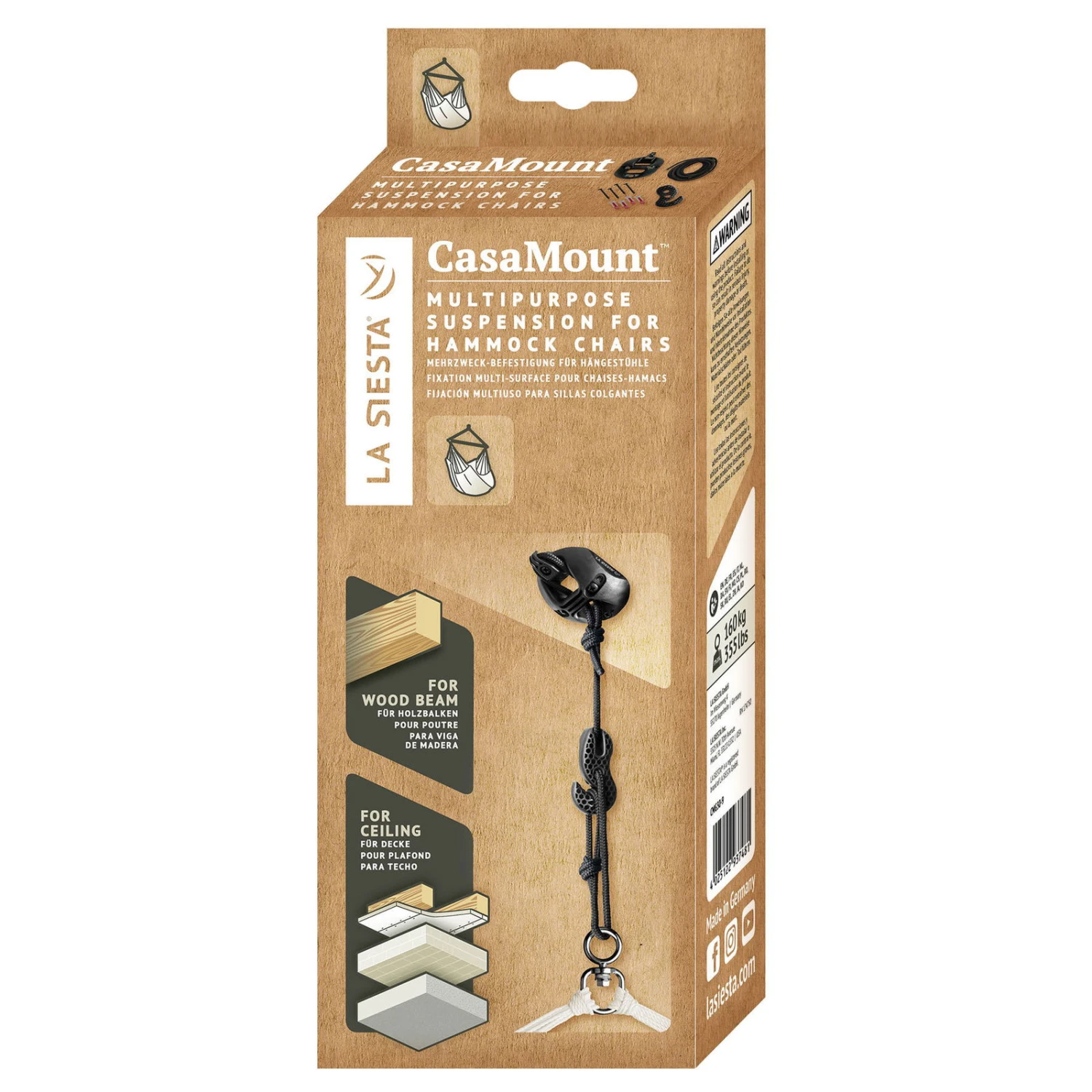 Mit der CasaMount für Hängesessel erhalten Sie ein Produkt, welches mehrere Vorteile vereint: Eine hohe Belastbarkeit, gute qualitative Merkmale, Benutzerfreundlichkeit und ein unschlagbarer Preis. Durch die glasfaserverstärkten Haken ist ein maximales Gewicht von 160 kg möglich, wobei sich die Befestigung jederzeit auf- sowie abhängen lässt. Eine spezielle SmartHook Technologie des Hakens von LA SIESTA macht das stufenlose justieren Ihres Hängestuhls möglich. Perfekte Bedingungen, um sich die eigene, kleine Wohlfühloase zu schaffen. Ob im Außen- oder Innenbereich eingesetzt, ist für die CasaMount Anbindung kein Problem, denn sie ist für alle gängigen Deckentypen geeignet. Das schwarz lackierte Material ist nicht nur sehr belastbar, sondern verfügt auch über eine gute Wetter- sowie UV-Beständigkeit. Dem ganzjährigen Einsatz im Freien steht also nichts mehr im Wege.