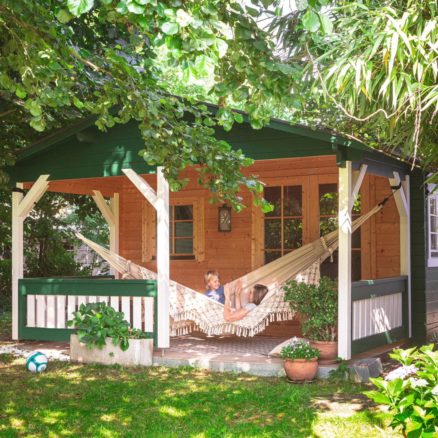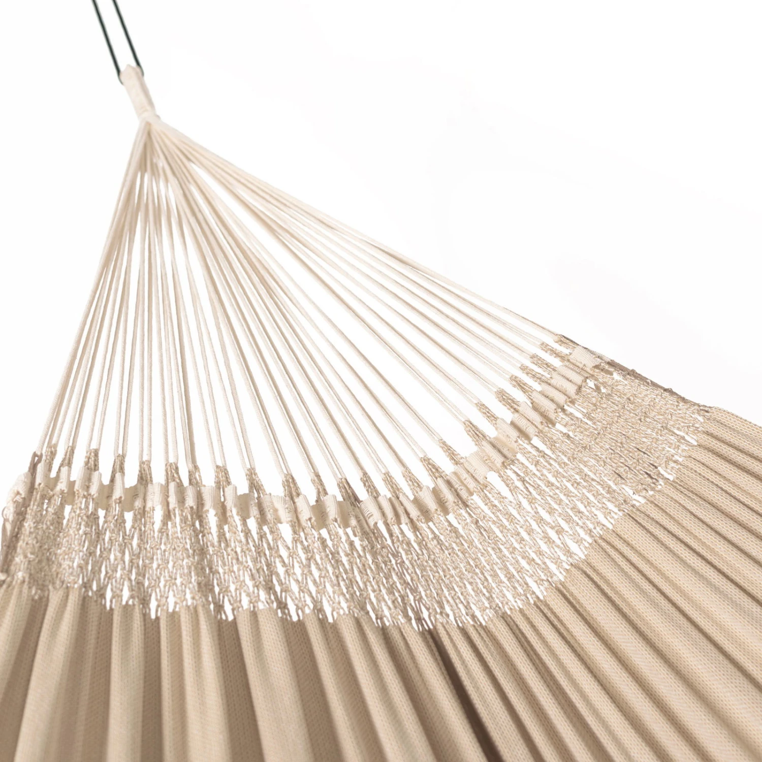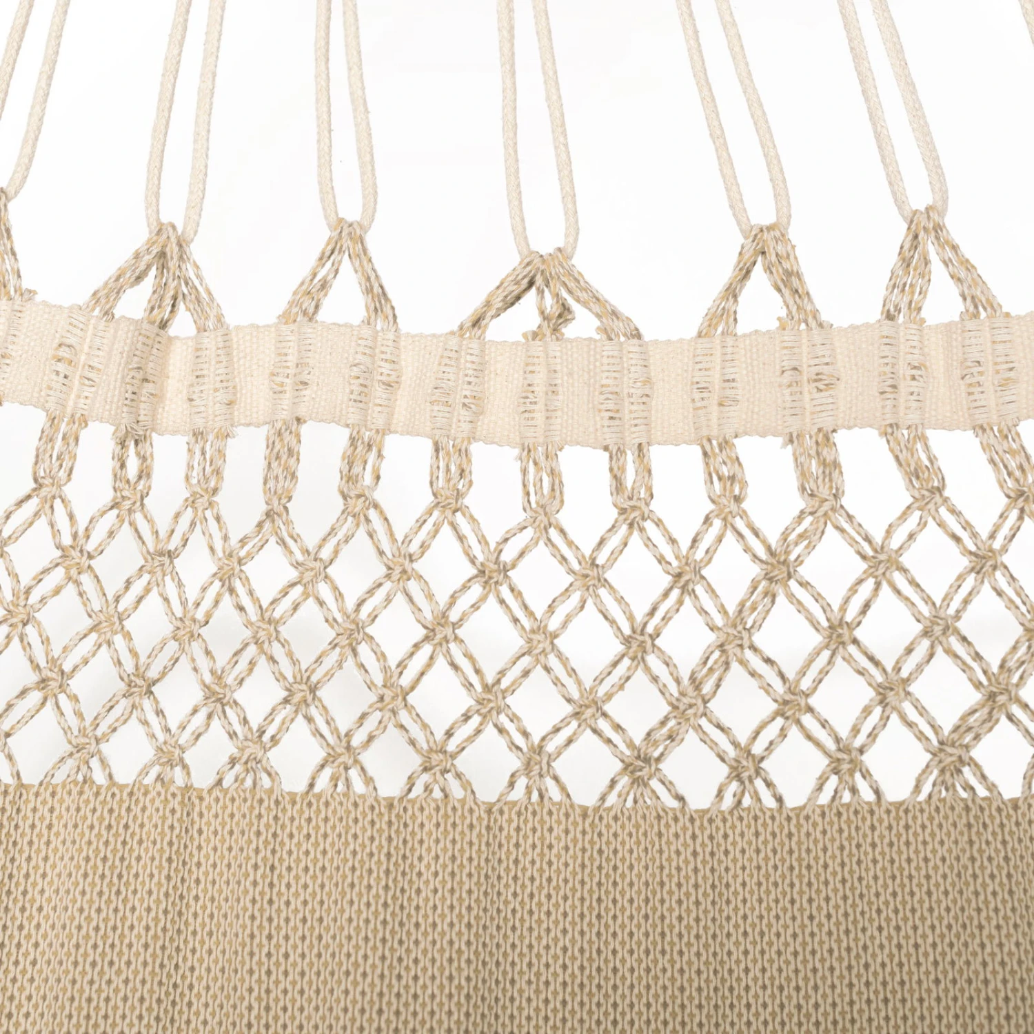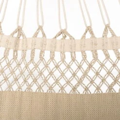 Mit einer komfortablen GröĂe von 180 x 400 x 180 cm ist die beigefarbene Kingsize HĂ€ngematte ‘Bossanova’ ein idealer Erholungsort fĂŒr die ganze Familie. Sie ist aus Bio-Baumwolle gefertigt und mit reiĂfesten Webkanten versehen. Deshalb hat sie eine hohe Belastbarkeit von 200 kg. Freuen Sie sich auf entspannende Stunden!