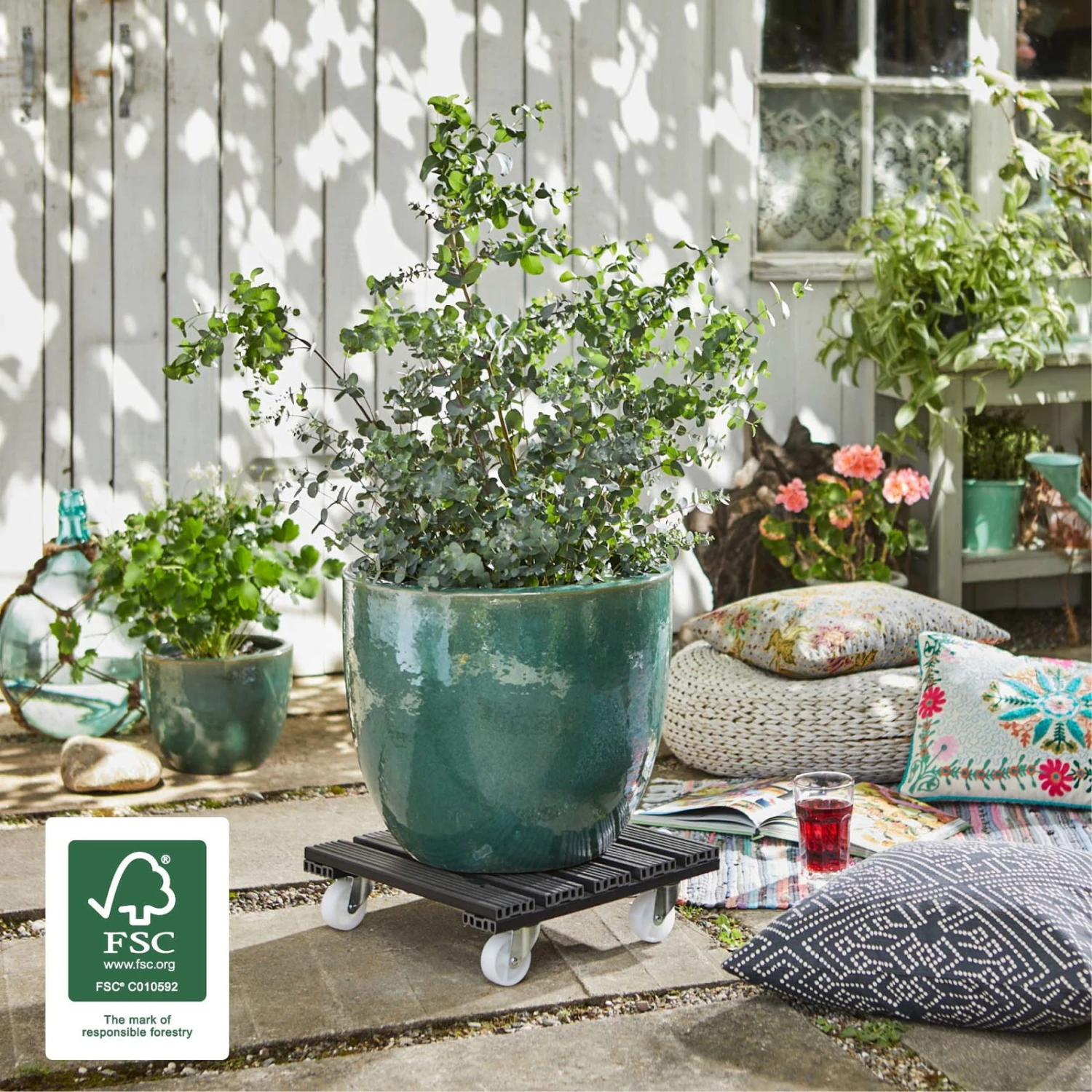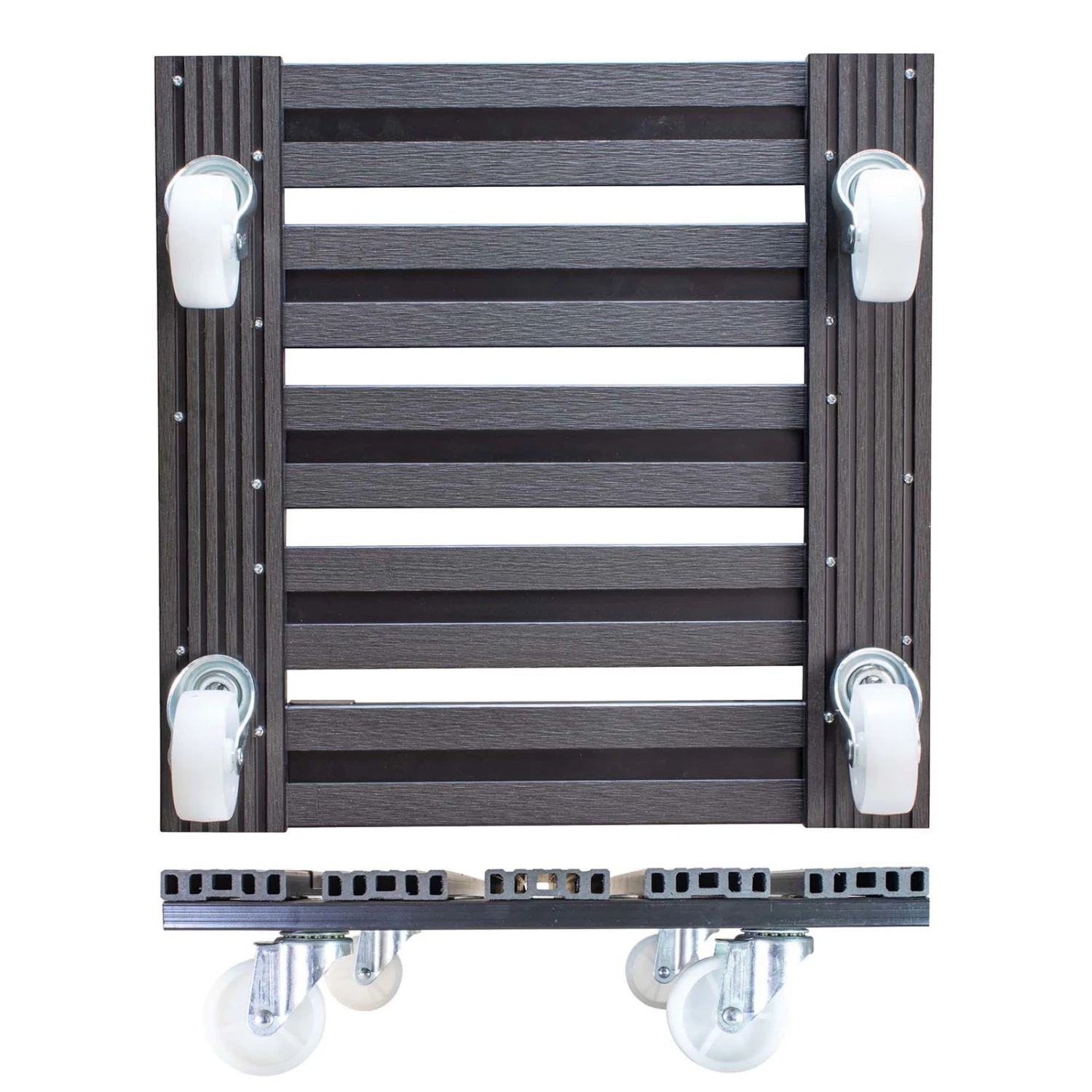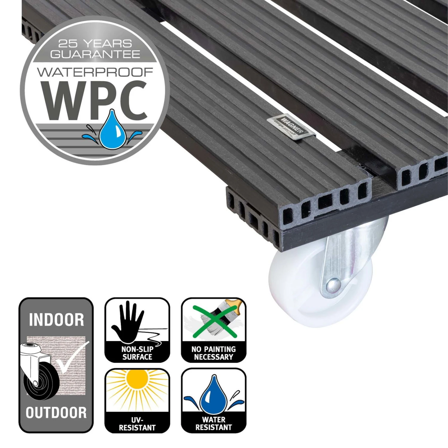 Die Umgestaltung Ihrer Terrassenbegrünung und Umzug Ihrer Pflanzen ins Winterquartier fällt Ihnen dank des Multi Rollers ganz einfach. Die anthrazitfarbene Tragfläche des Pflanzenrollers besteht aus dem Wood-Plastik-Composite WPC, einem innovativen wasserabweisenden, hochbelastbaren und UV-beständigen Verbundmaterial.