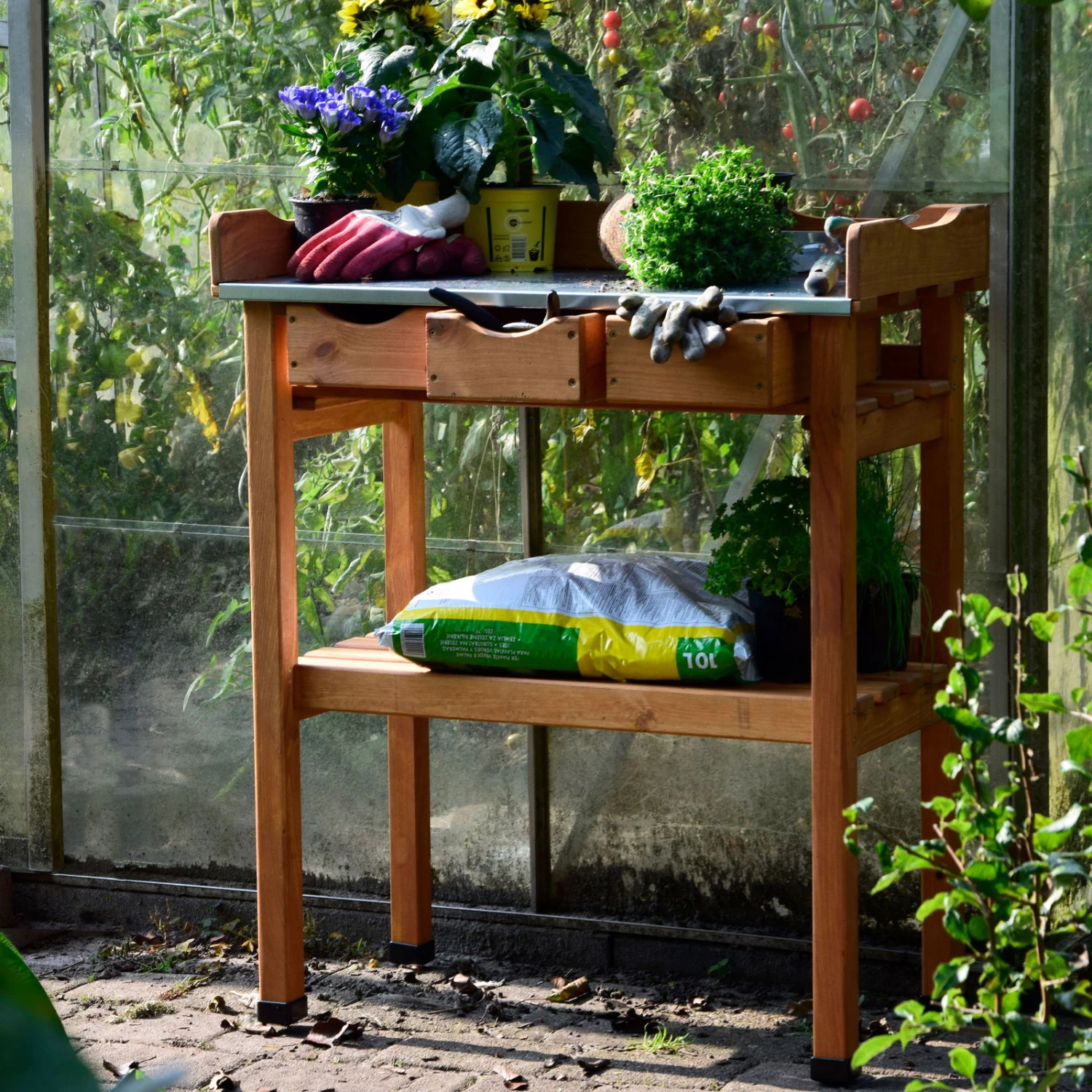 Wenn Sie Ihre Pflanzen umtopfen, die Aussaat im Gewächshaus vorbereiten oder zum Beispiel die Setzlinge pikieren müssen, dann ist dieser praktische Pflanztisch genau das Richtige für Sie. Die Werkbank aus massivem FSC®-zertifiziertem Kiefernholz überzeugt mit ergonomischer Höhe sowie bietet in den Schubladen und der Ablage Platz für Gartenwerkzeug und Utensilien.