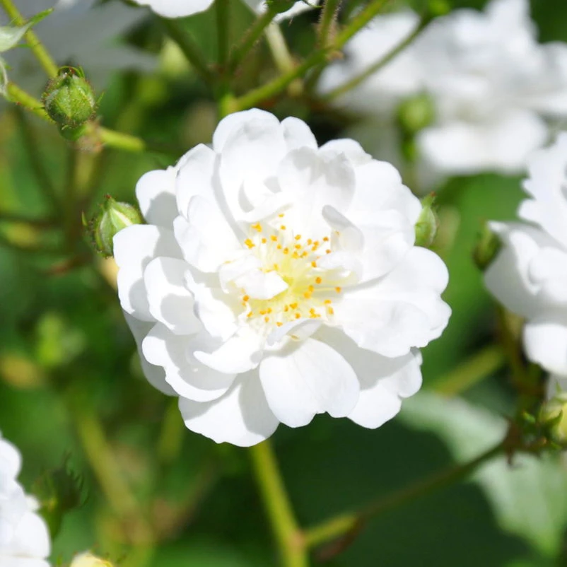 Verhelfen Sie alten Bäumen, hohen Mauern oder Hauswänden, Rosenbögen oder Obelisken zum strahlenden Blütenkleid. Die Ramblerrose ‘Guirlande d’Amour®’ beeindruckt mit strahlend weißen, gefüllten und duftenden Blüten, die die öfterblühende Rose während der Blütezeit von Juni bis Oktober zum wunderschönen Blickfang machen. Bienen, Hummeln & Co. wissen die gut erreichbaren, sonnengelben Staubgefäße der Bienenweide sehr zu schätzen.