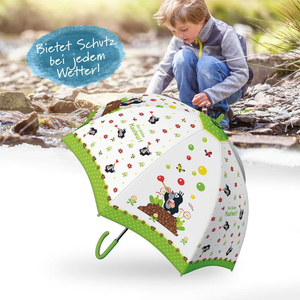 Mit dem Regenschirm ‘Der kleine Maulwurf’ in Grün macht ein Spaziergang bei jedem Wetter Spaß, denn der tapfere kleine Maulwurf und seine Freunde sind immer dabei. Der Kinderschirm bietet zuverlässigen Regenschutz und sorgt dank der Perlmuttoptik für strahlende Kinderaugen. Der Handgriff liegt bequem in der Hand, für ein Plus an Sicherheit sind die Spitzeln abgerundet.