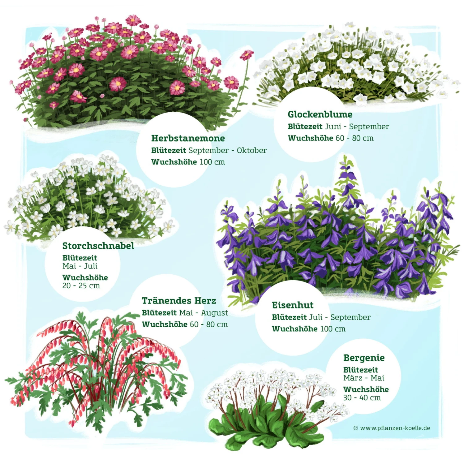 Alle Stauden eignen sich für frische, durchlässige Böden an halbschattigen bis schattigen Plätzen. Als Gruppe erstreckt sich ihr Blühzeitraum von April bis Oktober.