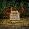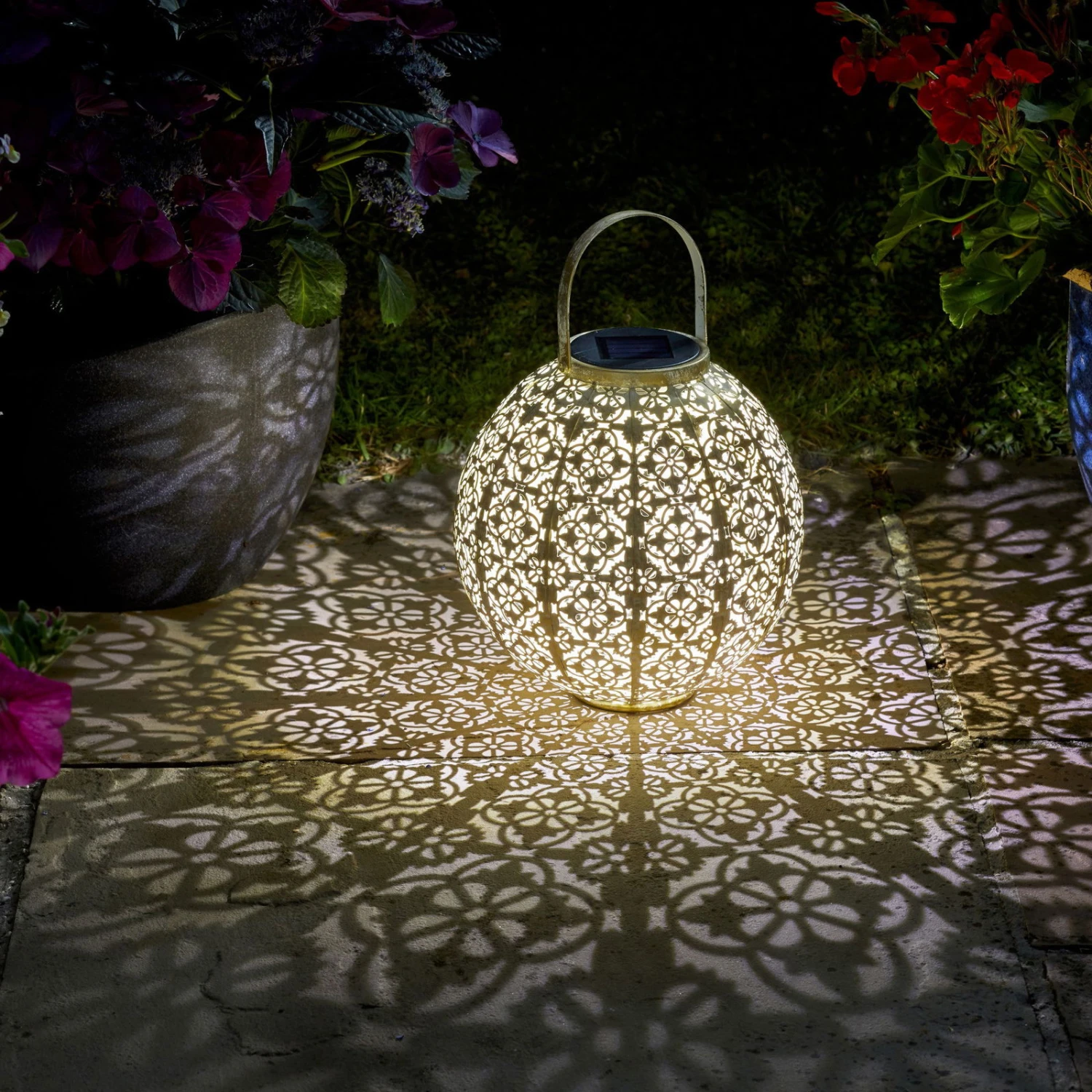Die außergewöhnliche und besonders hübsche Solarleuchte “Damast” aus Metall begeistert im nordafrikanischen Design und natürlicher Farbe. Die Solarlaterne in Form einer Kugel ist für den Outdoorbereich bestens geeignet und dafür konzipiert. Am Tag überzeugt die Solar Laterne als charmante Deko, bei Dunkelheit zeigt sie eine spektakuläre Beleuchtung in Ihrem Garten, auf der Terrasse, dem Balkon oder auf dem Weg Ihres Hauses. Mit der schönen Solar Laterne zaubern Sie Stück für Stück eine Wohlfühloase aus Ihrem Garten. Die solarbetriebene Leuchte besitzt ein warmweißes, angenehmes Licht und bringt Helligkeit nach Draußen. Das Muster in der Metallwand der Lampe wird durch das Licht reflektiert und zeichnet wunderschöne Ornamente auf den Boden und die Wand.