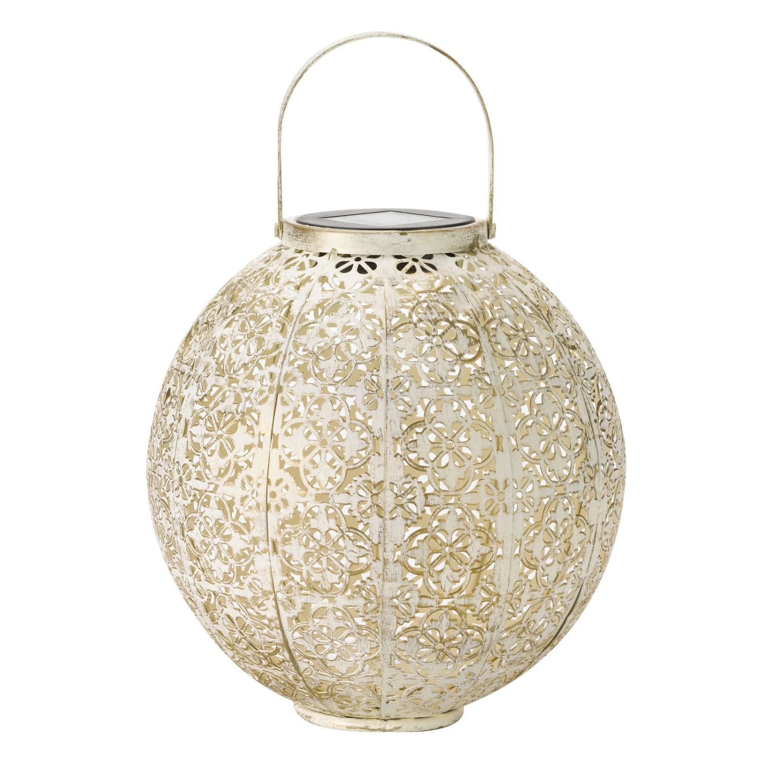 Die außergewöhnliche und besonders hübsche Solarleuchte “Damast” aus Metall begeistert im nordafrikanischen Design und trendiger Farbe. Die Solarlaterne in Form einer Kugel ist für den Outdoorbereich bestens geeignet und dafür konzipiert. Am Tag überzeugt die Solar Laterne als charmante Deko, bei Dunkelheit zeigt sie eine spektakuläre Beleuchtung in Ihrem Garten, auf der Terrasse, dem Balkon oder auf dem Weg Ihres Hauses. Mit der schönen Solar Laterne zaubern Sie Stück für Stück eine Wohlfühloase aus Ihrem Garten. Die solarbetriebene Leuchte besitzt ein warmweißes, angenehmes Licht und bringt Helligkeit nach Draußen. Das Muster in der Metallwand der Lampe wird durch das Licht reflektiert und zeichnet wunderschöne Ornamente auf den Boden und die Wand.
