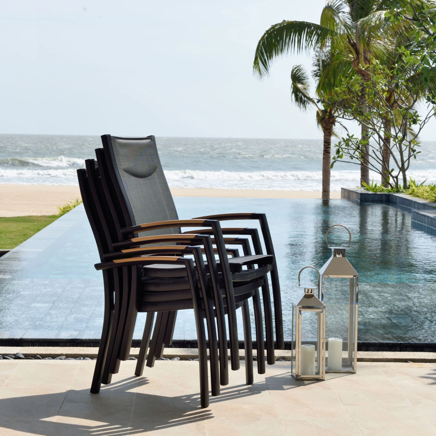 Genießen Sie mit dem Stapelsessel ‘Panama’ maximalen Komfort im Außenbereich und werten Sie Ihre Dining-Landschaft auf eine stilvolle Art auf. Dieser schwarze Stapelsessel ist dank seines Alu-Gestells ein mobiles Leichtgewicht und überzeugt zugleich mit hoher Stabilität in Kombination mit maximalem Sitzkomfort. Nach dem Saisonende stapeln Sie den Sessel ‘Panama’ auf Ihrer Terrasse oder im Schuppen platzsparend auf.