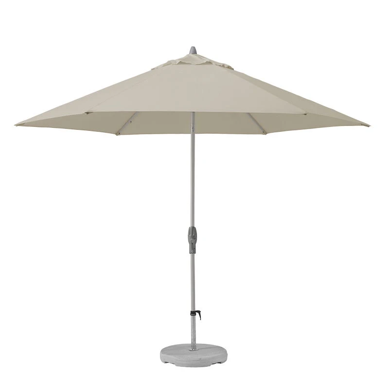 Durch den Kurbelantrieb lässt sich der runde Mittelstockschirm “Shell Turn” kinderleicht öffnen und schließen. Die gewünschte Schrägposition des Schirmdaches wird anhand des Drehmechanismus am Kurbelgehäuse ganz einfach und unkompliziert stufenlos eingestellt. Mast, Gestell und Streben dieses hochwertigen Schirms bestehen aus pulverbeschichtetem, platinumfarbenem Aluminium, der Polyesterbezug bietet hervorragenden Schutz vor der Sommersonne.